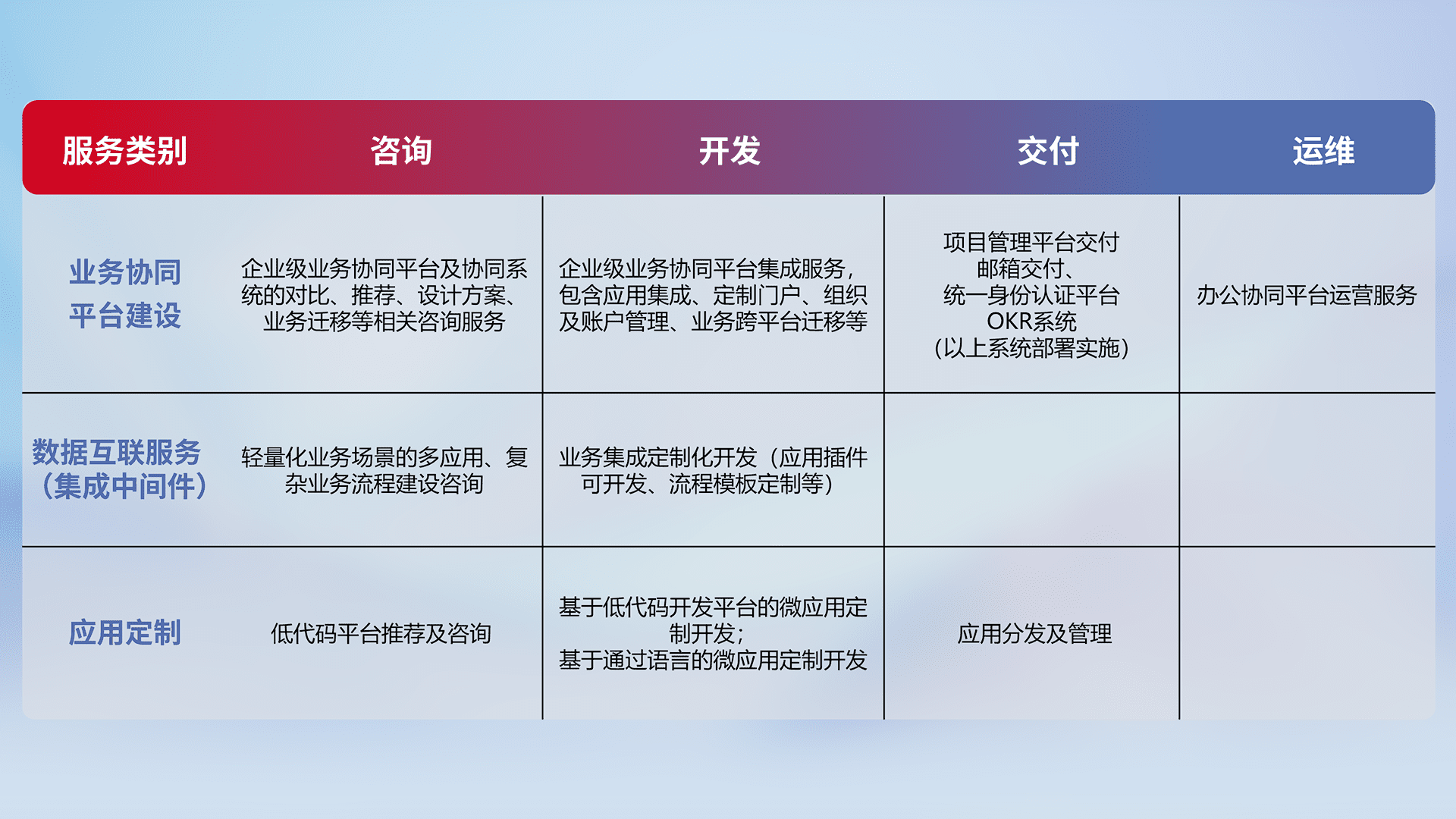 针对钉钉、、、企微、、、、IDaas等平台级产品提供产品的规划、、、方案、、交付、、、、定制化开发等服务,,实现如统一协同办公、、智能客户服务、、、混合会议管理、、、智能数据查询、、、、等业务场景,,实现数字化转型。。